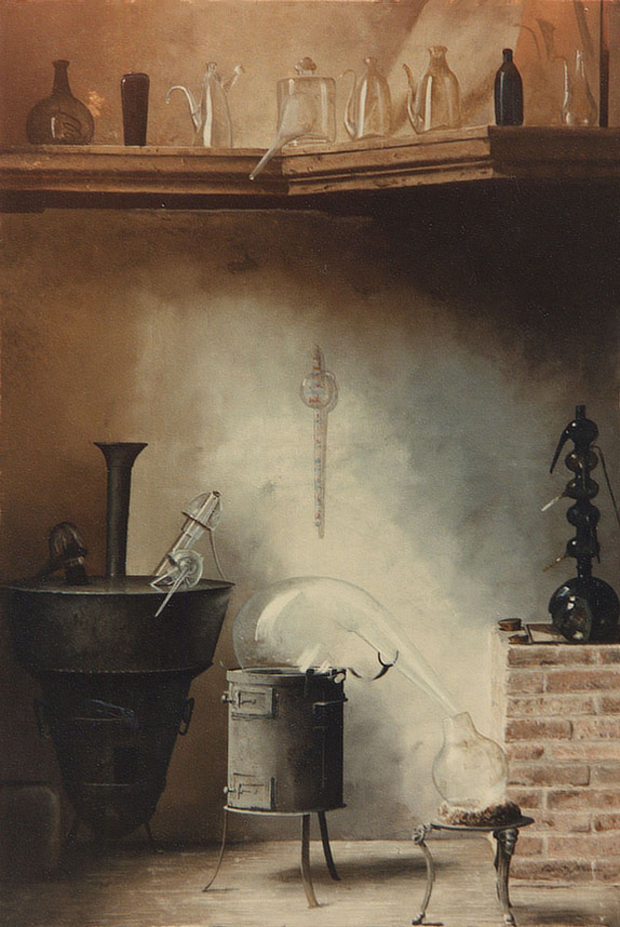 Al museo della scienza e della tecnica di Monaco di Baviera vidi di questo ambiente del quale realizzai uno schizzo dettagliato quanto possibile, poi un dipinto. Qui l'uomo ha davvero iniziato il suo dominio e la sua manipolazione della natura. Ben presto sarebbe arrivato ai polimeri. E addio natura.