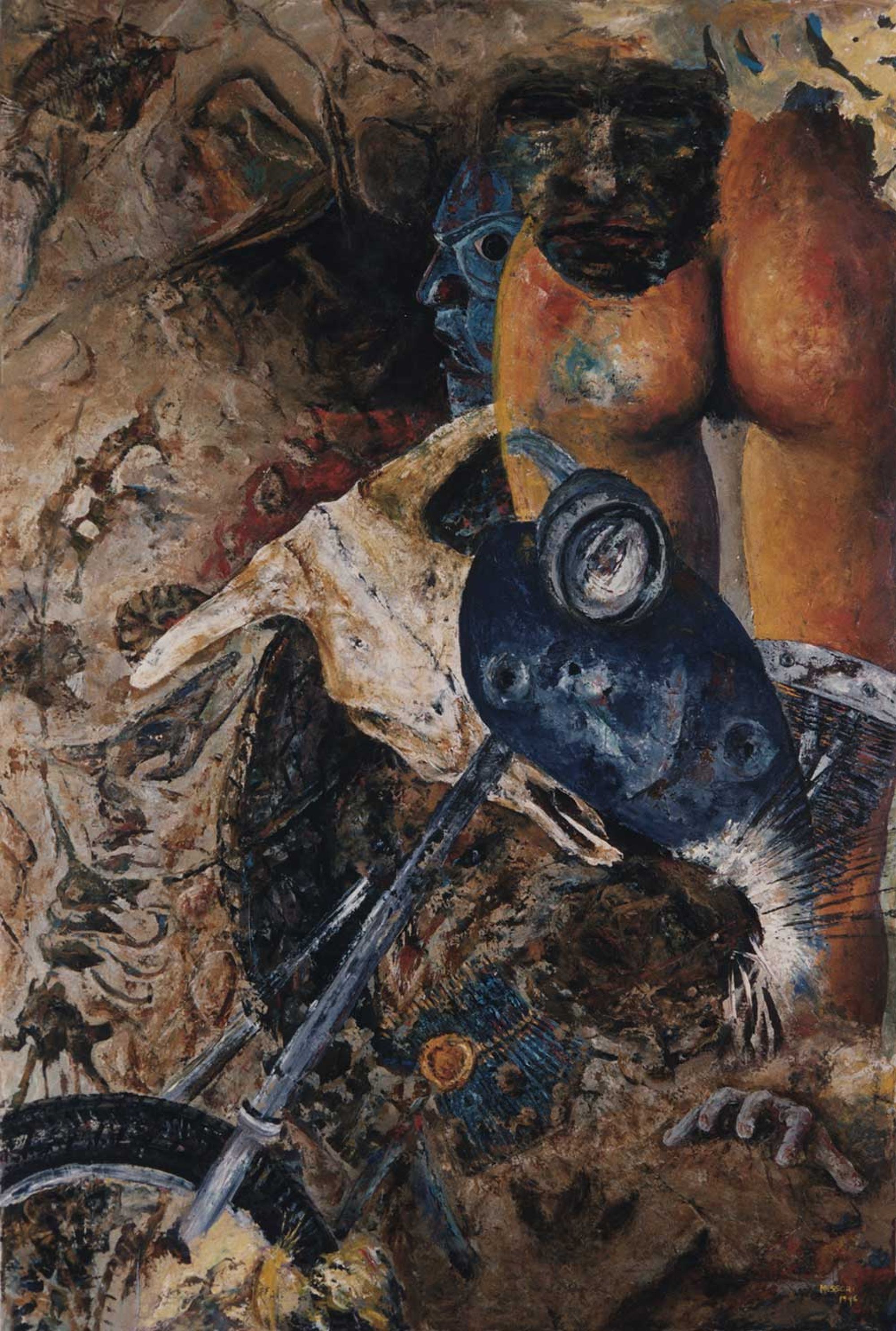 Nel dipinto ho preferito fossilizzare i miti, anche questi sono feticci. Feticci che, come per quelli tribali, emanano il loro potere massimo quando sono creati, per poi perderlo nel tempo, riacquistandolo a sprazzi quando li si arricchiscono di nuove reliquie.